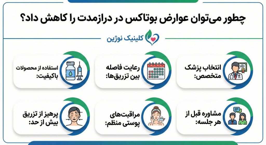 وقتی بوتاکس با دوز منطقی، فاصله مناسب و برنامهریزیشده تزریق بشه، احتمال بروز عوارض درازمدت به حداقل میرسه.